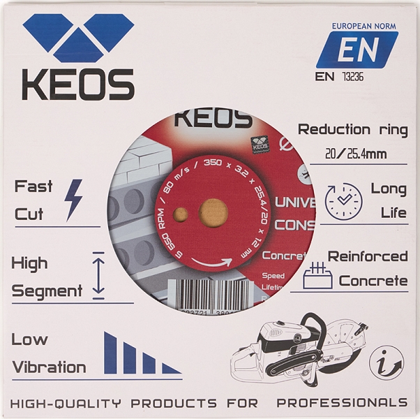 Диск алмазный сегментный Keos Universal Construction 350 мм (Кеос Универсал Констракшен 350 мм) предназначен для резки бетона, железобетона и кирпича на бензорезах, электрических резчиках и плиткорезах, каменерезных станках, стенорезных машинах, швонарезчиках, как с подачей воды, так и всухую.