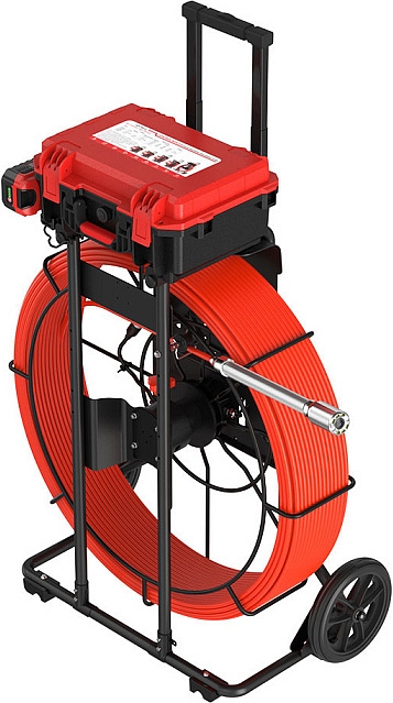 - Головка камеры Ø 39 × 77 мм и проталкиваемый кабель Ø 9 мм × 120 м из стекловолокна со счетчиком длины и системой торможения, подходящие для труб Ø 160 – 400 мм, длиной до 120 м